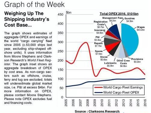 常言道,省小錢(qián)就是攢大錢(qián),一直是航運(yùn)業(yè)記在心里的話。那么營(yíng)運(yùn)一艘船需要花多少銀子?我們算了算成本,整個(gè)航運(yùn)業(yè)的船舶運(yùn)營(yíng)費(fèi)用(OPEX)總數(shù)竟然首次突破了1000億美元大關(guān)!